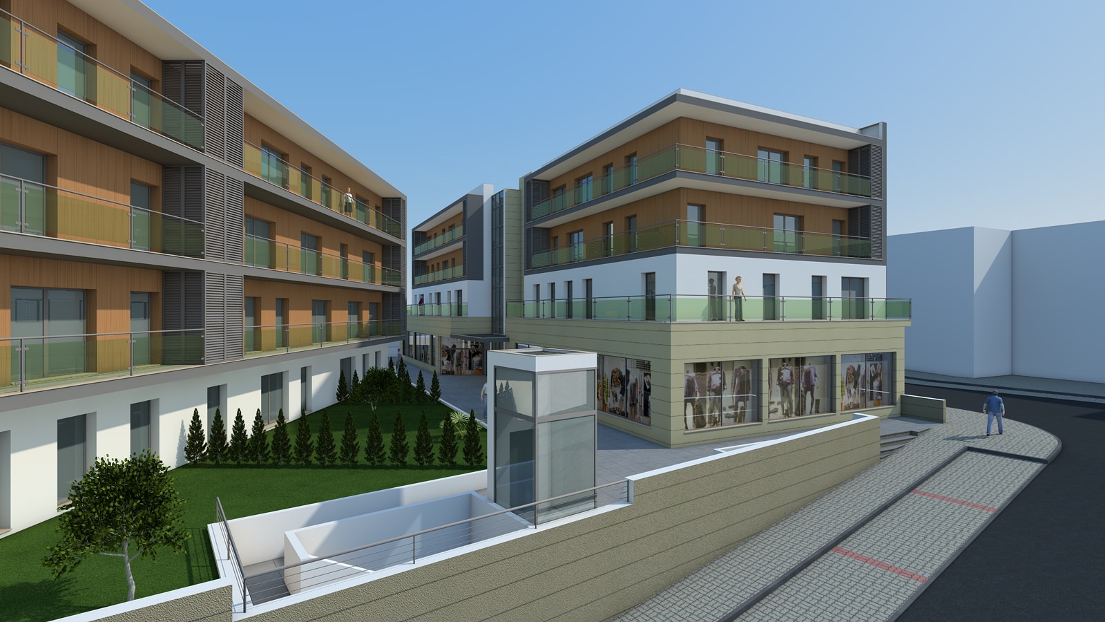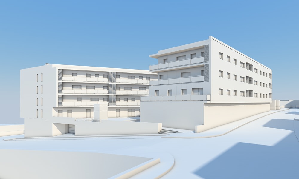 Os corpos da supra-estrutura acompanham os arruamentos que confinam a propriedade. Pela disposição das vias onde assentam, os volumes formam um V, aberto, para o campo desportivo da Arregaça.