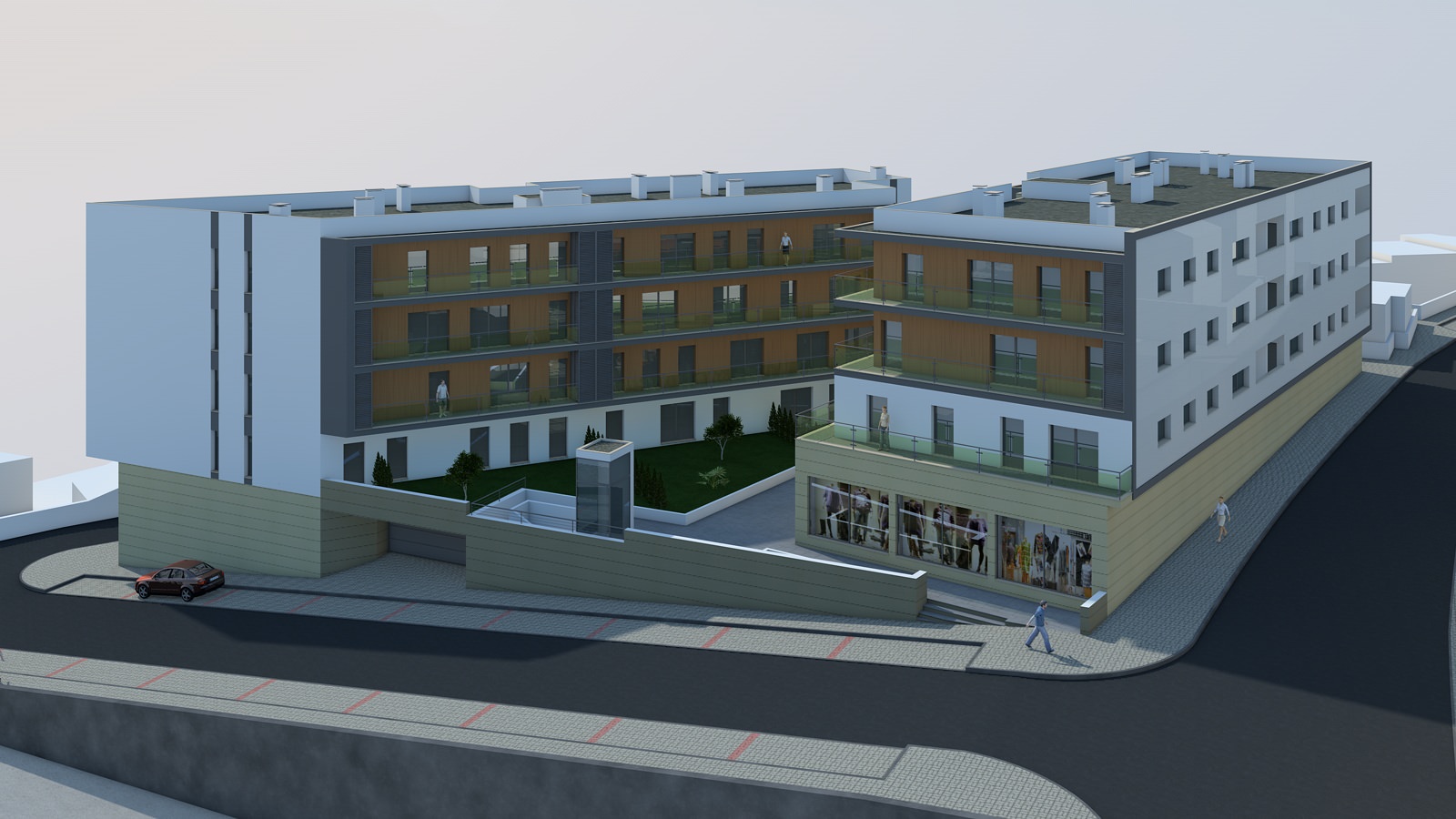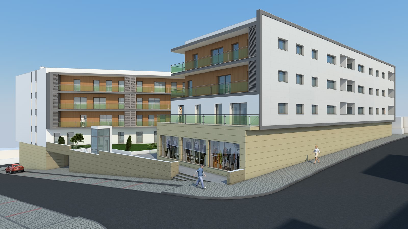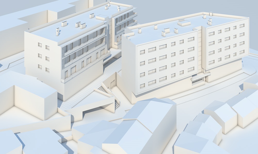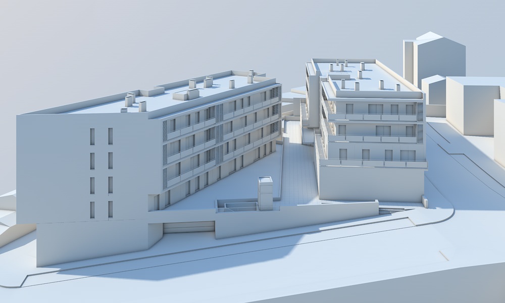 A proposta pode-se descrever como sendo um edifício dividido em dois volumes com escalonamento de pisos diferenciados, que assentam numa base comum.
